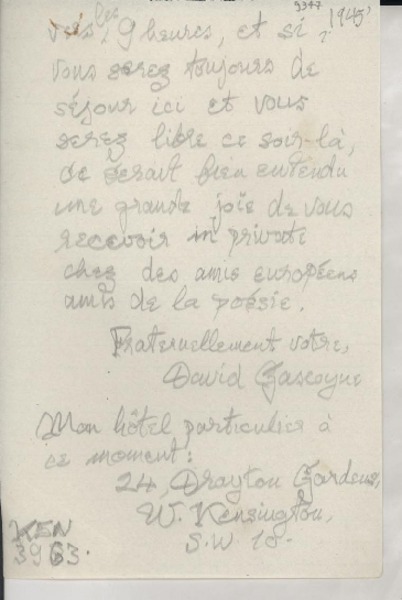 [Carta] [1945?], Kensington, [Inglaterra] [a] [Gabriela Mistral] [manuscrito] David Gascogne.