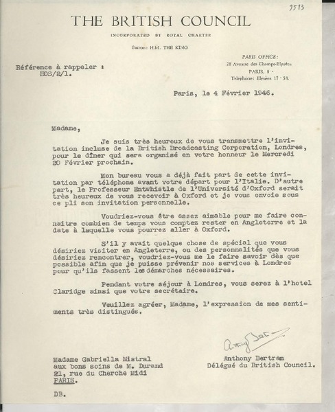 [Carta] 1946 févr. 4, Paris, [Francia] [a] Gabriella [i.e. Gabriela] Mistral, Paris, [Francia] [manuscrito] Anthony Bertram.