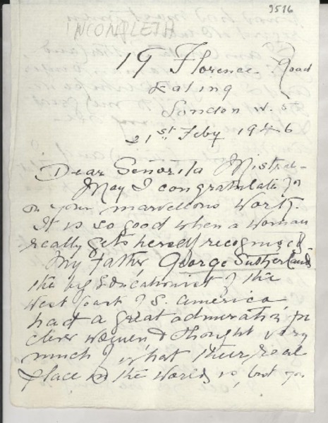 [Carta] 1946 Feb. 21, London, [England] [a] [Gabriela] Mistral [manuscrito] De una admiradora.