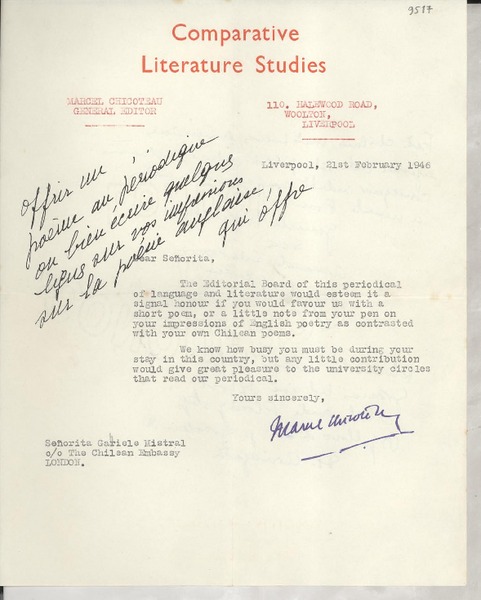 [Carta] 1946 Feb. 21, Liverpool, [England] [a] Gariele [i.e. Gabriela] Mistral, London, [England] [manuscrito] Marcel Chicoteau.