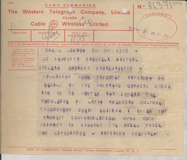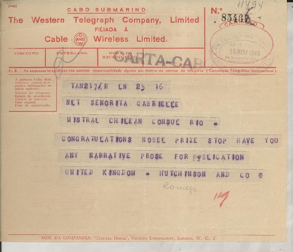 [Telegrama] 1945 Nov. 16, United Kingdom [a la] Señorita Gabrielle [i.e. Gabriela] Mistral, Rio, [Brasil] [manuscrito] Hutchinson and Co.
