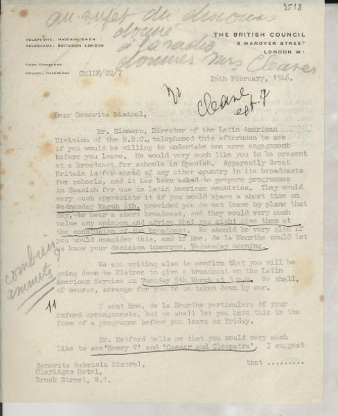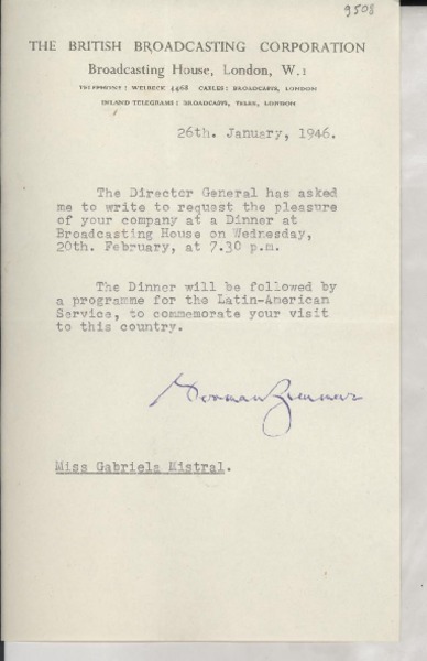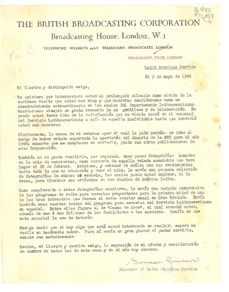 [Carta] 1946 mayo 9, Broadcasting House, London, W. I, [England] [a] Mi ilustre y distinguida amiga [Gabriela Mistral] [manuscrito] Director of Latin American Service.