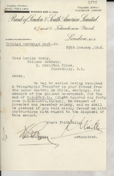 [Carta] 1946 Jan. 25, London [a] Lucila Godoy, Picadilly, [Londres] [manuscrito] Bank of London & South America Limited.