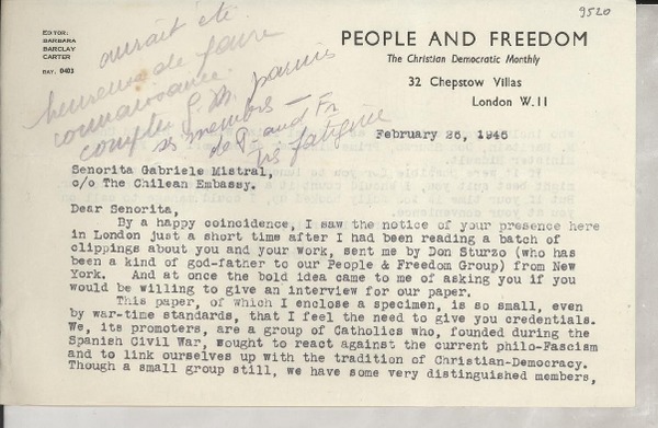 [Carta] 1946 Feb. 26, London, [England] [a] Gabriela Mistral [manuscrito] Barbara Barclay Carter.