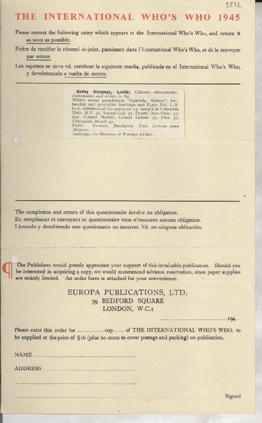 [Carta] 1945, London [a] Lucila Godoy A. [manuscrito] The International Who's who.