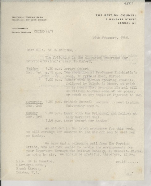 [Carta] 1946 Mar. 14, London, Inglaterra [a] Miss Mistral, Claridge's Hotel, Brook Street [manuscrito] Secretary General.