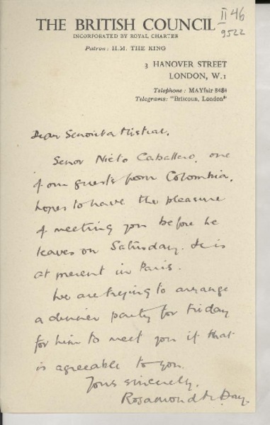 [Carta] [1946] [Feb.], London, [England] [a] [Gabriela] Mistral [manuscrito] Rosamond M. Dan.