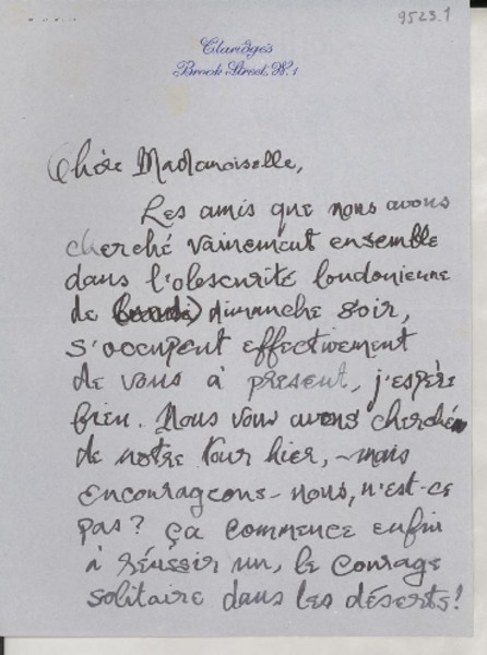 [Carta] 1946 Feb. 26, London, [England] [a la] Mlle. de la Meurthe, Claridges Hotel, London, [England] [manuscrito] Rosamond M. Dan.
