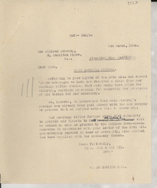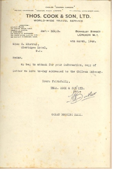 [Carta] 1946 Mar. 4, London [a] Gabriela Mistral [manuscrito] S. Cook & Son Ltd.