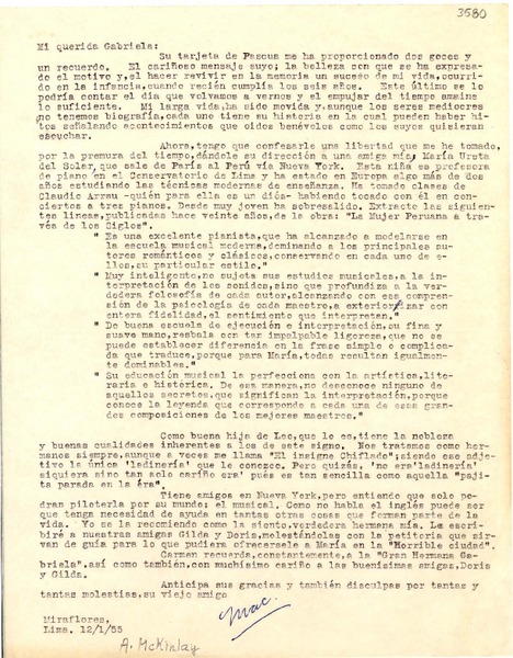 [Carta] 1955 ene. 12, Miraflores, Lima, [Perú] [a] Gabriela Mistral [manuscrito] A. McKinlay.