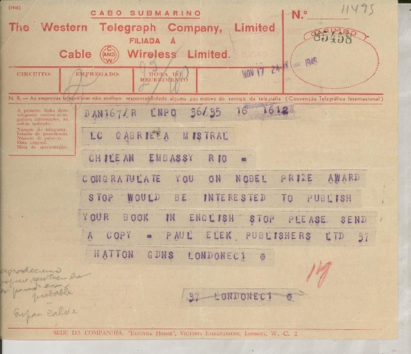 [Telegrama] 1945 Nov. 17, London, [England] [a] Gabriela Mistral, Rio, [Brasil] [manuscrito] Paul Elek Publishers Ltd.