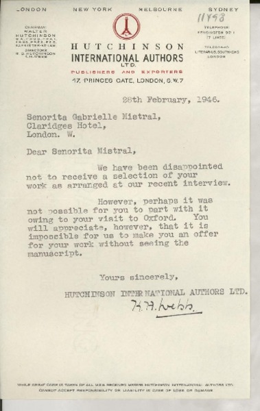 [Carta] 1946 Feb. 28, London, [England] [a la] Señorita Gabrielle [i.e. Gabriela] Mistral, Claridges Hotel, London, [England] [manuscrito] Hutchinson International Authors Ltd.