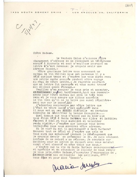 [Carta] 1947 mayo 25, Los Angeles, California, [EE.UU.] [a] [Gabriela Mistral] [manuscrito] Marie Huxley.