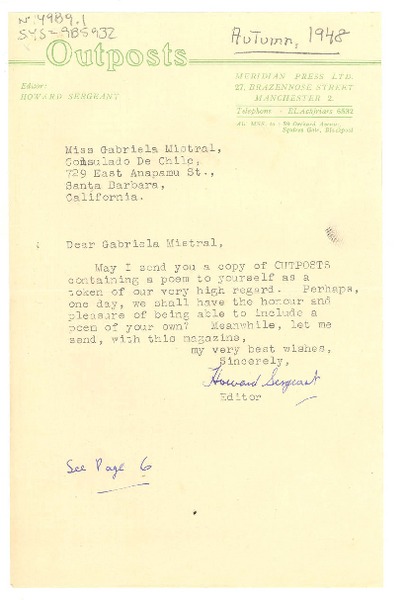 [Carta] [1948 otoño], [Manchester, Inglaterra] [a] Gabriela Mistral, Santa Barbara, California, [Estados Unidos] [manuscrito] Howard Sargeant.