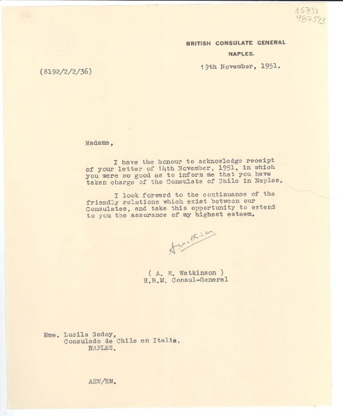 [Carta] 1951 Nov. 19, Naples, [Italy] [a la] Mme. Lucila Godoy, Consulado de Chile en Italia, Naples, [Italy] [manuscrito] A. E. Watkinson, H.B.M. Consul-General.