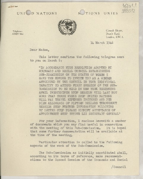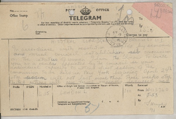 [Telegrama] 1946 Mar. 6, London, Inglaterra [a] Gabriela Mistral [manuscrito] Secretary General.