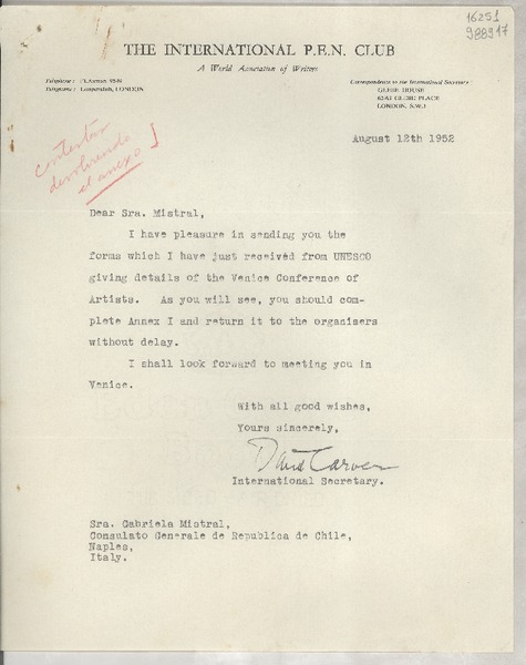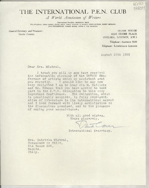 [Carta] 1952 Aug. 12, London, [Inglaterra] [a] Sra. Gabriela Mistral, Consulado Generale de Republica de Chile, Naples, Italy [manuscrito] Dana Carver.