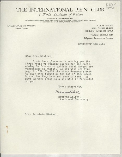 [Carta] 1952 Sept. 4, Glebe House, 6263 Glebe Place, Chelsea, London, S.W. 3, London, [England] [a la] Sra. Gabriela Mistral [manuscrito] / Maureen Kilroe, Assistant Secretary.