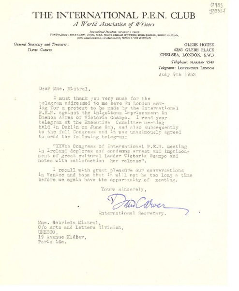 [Carta] 1953 July 9, Chelsea, London, [Inglaterra] [a] Dear Mme. Mistral [manuscrito] David Carver.
