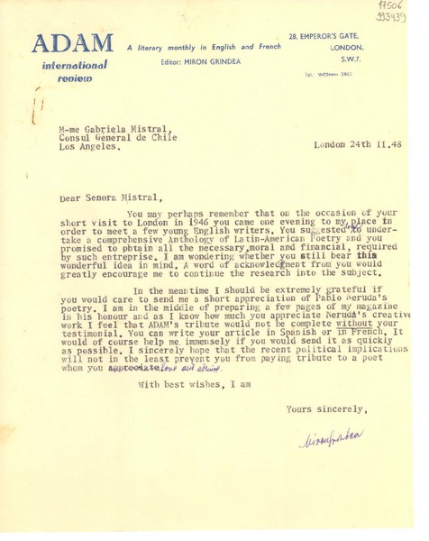[Carta] 1948 Feb. 24, London, [Inglaterra] [a] Gabriela Mistral, Consul General de Chile, Los Angeles [manuscrito] Miron Grindea.