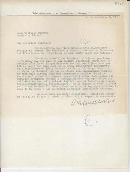 [Carta] 1950 nov. 6, [Washington D. C., EE.UU.] [a] Gabriela Mistral, Veracruz, México [manuscrito] Rafael Heliodoro Valle.