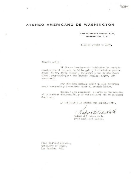 [Carta] 1949 ago. 10, [Washington D. C.] [a] Gabriela Mistral, Los Angeles, California [manuscrito] Rafael Heliodoro Valle.