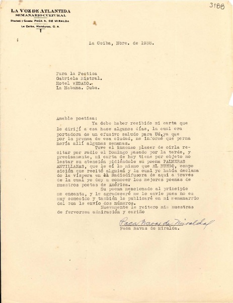 [Carta] 1938 nov., La Ceiba, Honduras [a] Gabriela Mistral, Hotel Vedado, La Habana, Cuba [manuscrito] Paca Navas de Miralda.