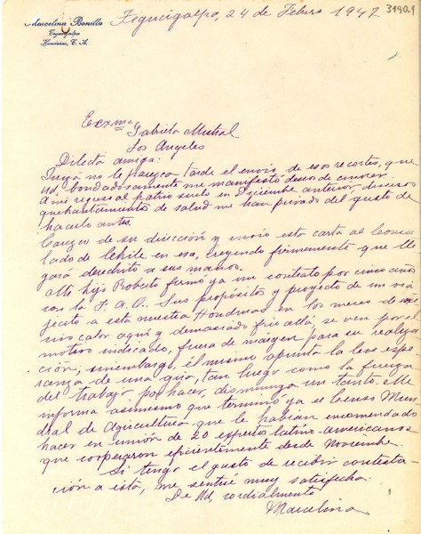 [Carta] 1947 feb. 24, Tegucigalpa, Honduras [a] Gabriela Mistral, Los Angeles, [EE.UU.] [manuscrito] Marcelina Bonilla.