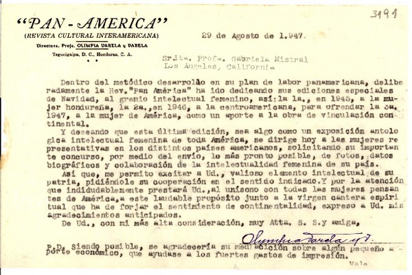 [Carta] 1947 ago. 29, Tegucigalpa, Honduras [a] Gabriela Mistral, Los Angeles, California, [EE.UU.] [manuscrito] Olimpia Varela y Varela.