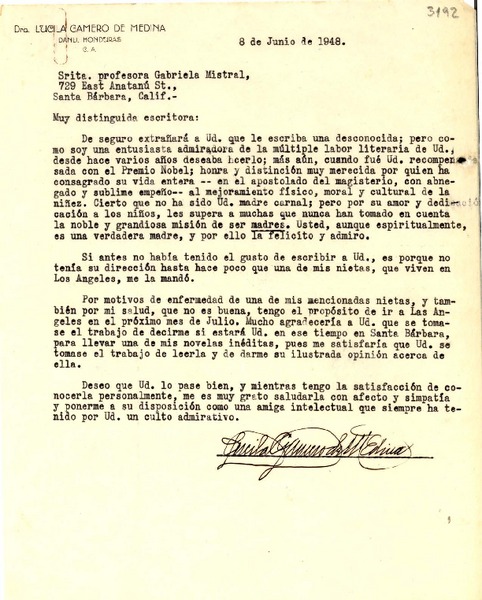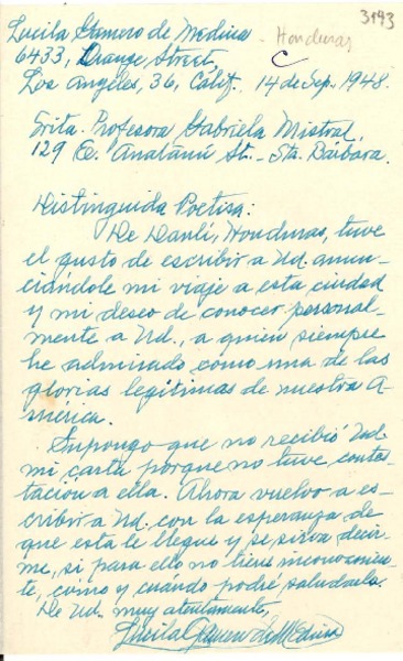 [Carta] 1948 sept. 14, Los Angeles, Calif., [EE.UU.] [a] Gabriela Mistral, Santa Bárbara, [EE.UU.] [manuscrito] Lucila Gamero de Medina.