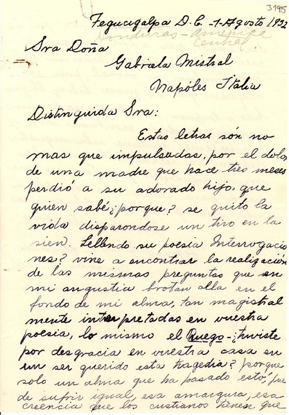 [Carta] 1952 ago. 1, Tegucigalpa, Honduras [a] Gabriela Mistral, Nápoles, Italia [manuscrito] Juana C. de Velásquez.
