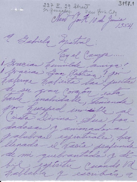 [Carta] 1954 jun. 10, New York, [EE.UU.] [a] Gabriela Mistral [manuscrito] Armando Méndez Fuentes.
