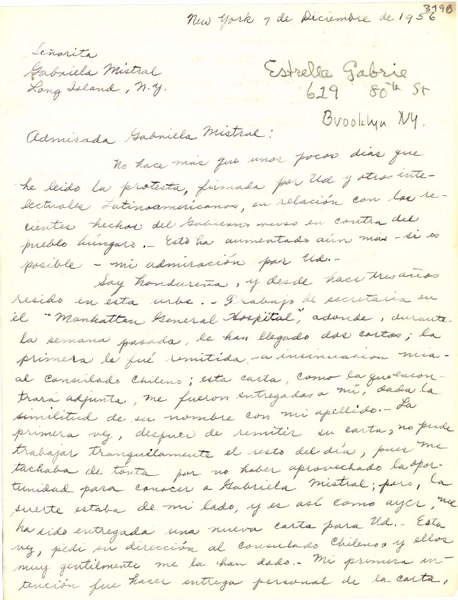 [Carta] 1956 dic. 7, New York, [EE.UU.] [a] Gabriela Mistral, Long Island, N. Y., [EE.UU.] [manuscrito] Estrella N. Gabrie.