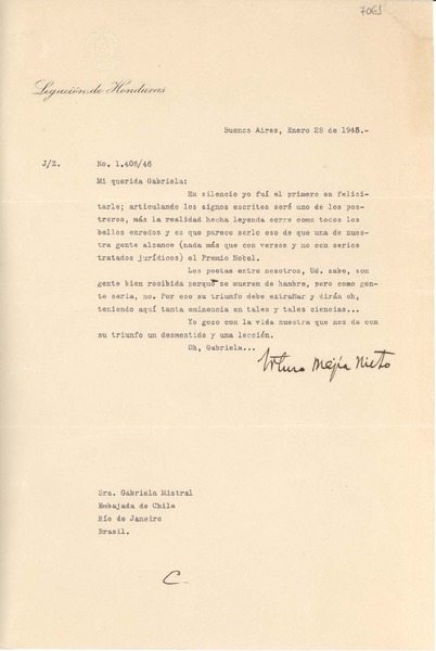 [Carta] 1946 ene. 28, Buenos Aires [a] Gabriela Mistral, Río de Janeiro, Brasil [manuscrito] Arturo Mejía Nieto.