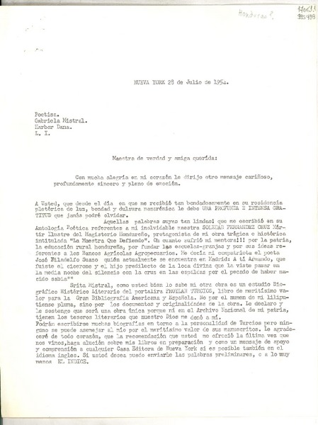 [Carta] 1954 jul. 28, New York, [EE.UU.] [a] Gabriela Mistral [manuscrito] Armando Méndez Fuentes.
