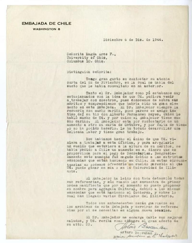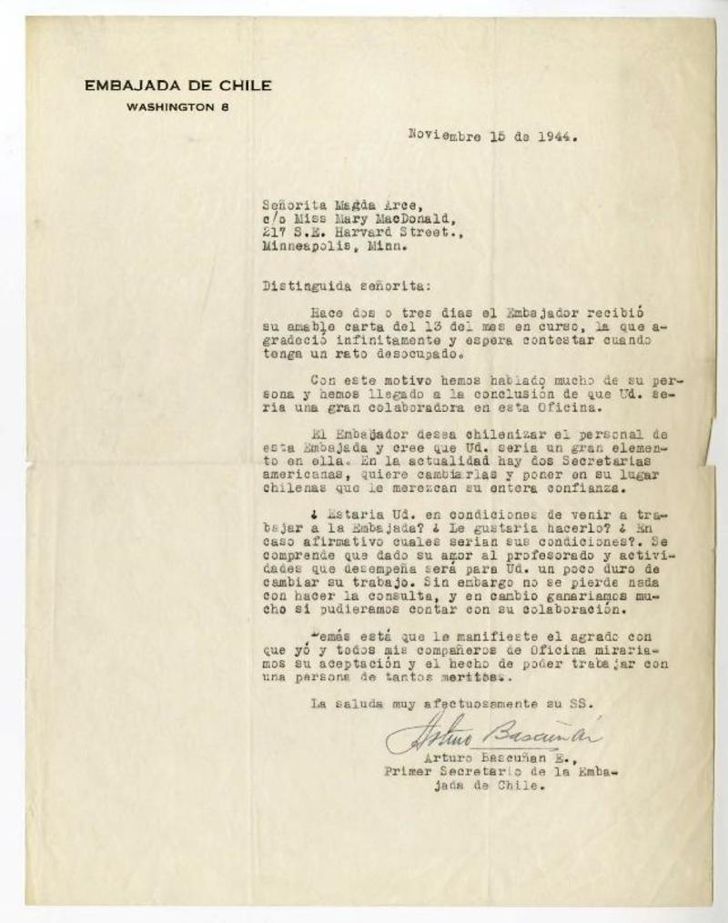 Washington [a] Magda Arce, Minneapolis carta, 1944 Noviembre 15, [manuscrito] Arturo Bascuñan.
