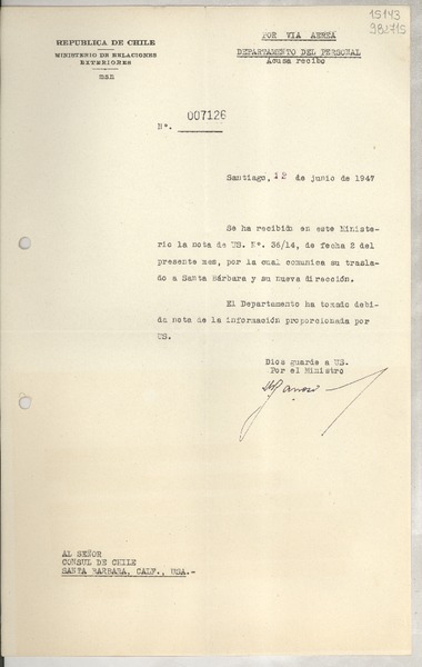[Circular] N° 01095-112, 1948 abr. 13, Nueva York, [Estados Unidos] [al] señor Cónsul de Chile, Santa Bárbara, California [manuscrito] Alfonso Grez.