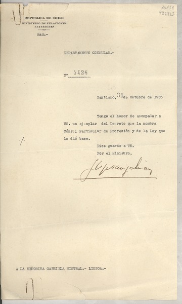 [Oficio] N° 732484, 1949 sept. 21, México, D.F., México [a la] Señorita, Gabriela Mistral, Cónsul de Chile en Comisión, Jalapa, Ver., [México] [manuscrito] / Enrique Gajardo V. Embajador de Chile.