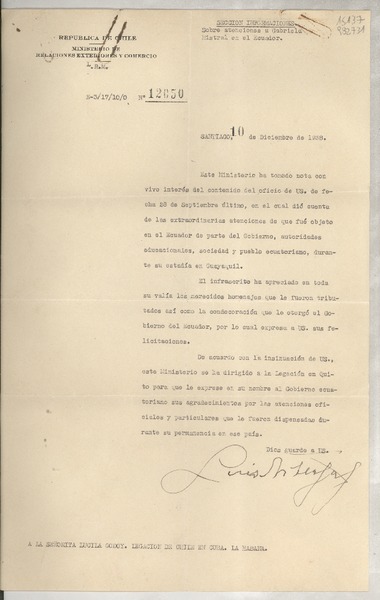 [Circular] N° 1061442, 1937 nov. 6, Lima, [Perú] [a] Señor Ministro de Relaciones Exteriores y Comercio, Santiago de Chile [manuscrito] / Luis Subercaseaux.