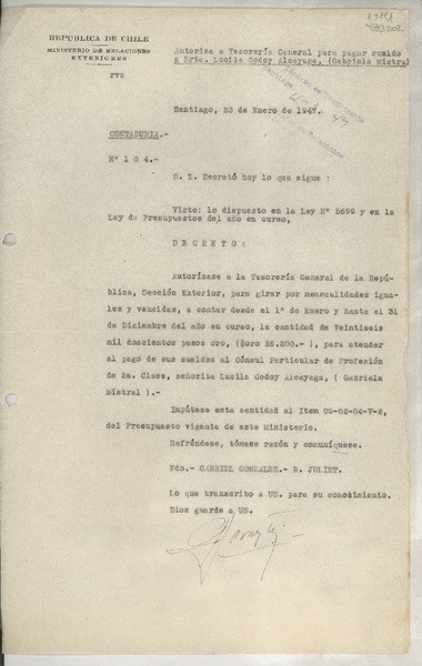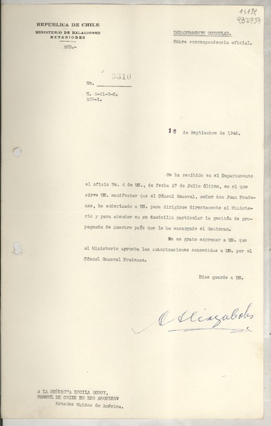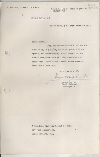 [Circular] N° 2112-2033, 1947 sept. 5, New York, [Estados Unidos] [a] Gabriela Mistral, Cónsul de Chile, 729 East Anapamu St., Santa Bárbara, Cal. [manuscrito] Jorge Hayler.