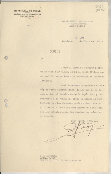 [Oficio] N° 6322, 1948 ago. 15, Santa Barbara, [EE.UU.] [al] Señor Cónsul General de Chile en Nueva York, [EE.UU.] [manuscrito] / Lucila Godoy, Cónsul.