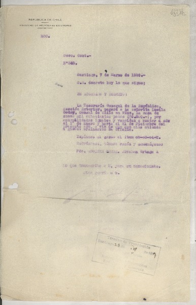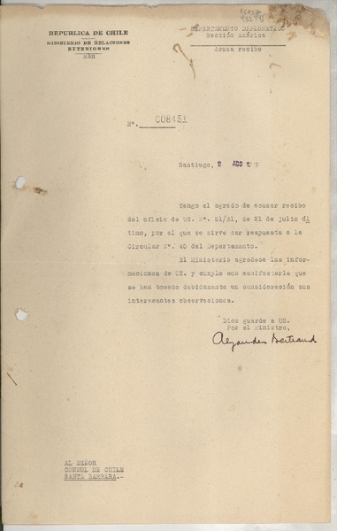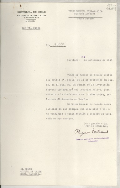 [Circular] N° 00819-514, 1948 mar. 22, Nueva York, [Estados Unidos] [al] señor Cónsul de Chile, Santa Bárbara, California [manuscrito] Alfonso Grez.