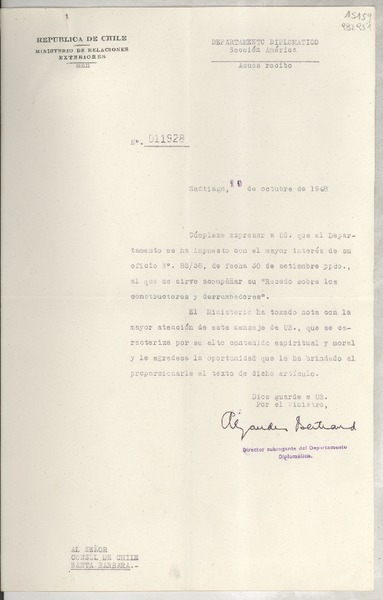 [Oficio] N° 8426, 1948 oct. 3, Santa Barbara, [Estados Unidos] [al] Señor Cónsul General de Chile en Nueva York [manuscrito] / Lucila Godoy.