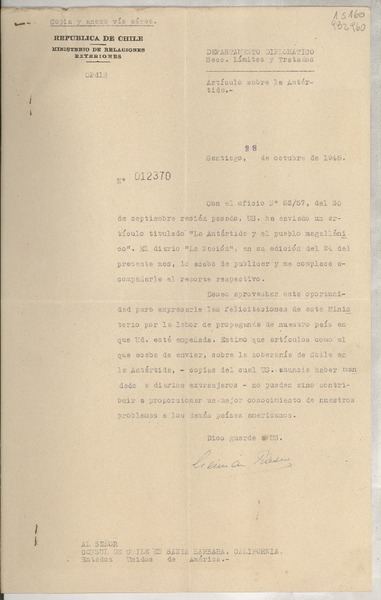 [Oficio] N° 8827, 1948 oct. 14, Santa Barbara, [Estados Unidos] [al] Señor Cónsul General de Chile en Nueva York [manuscrito] / Lucila Godoy.