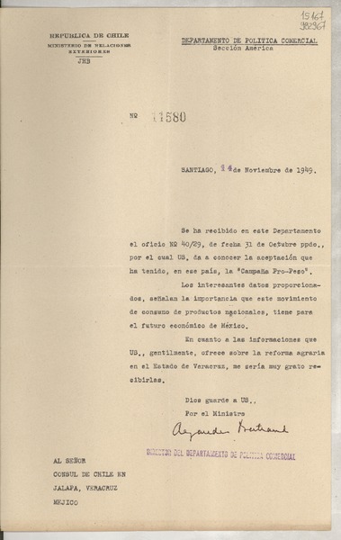 [Oficio] N° 921706, 1949 nov. 8, México, D.F., México [a la] Señorita, Gabriela Mistral, Cónsul de Chile en Comisión, Jalapa, Ver., [México] [manuscrito] / Alberto Sepúlveda Contreras, Ministro, Encargado de Negocios.