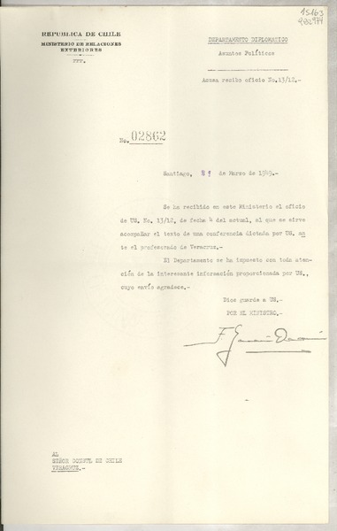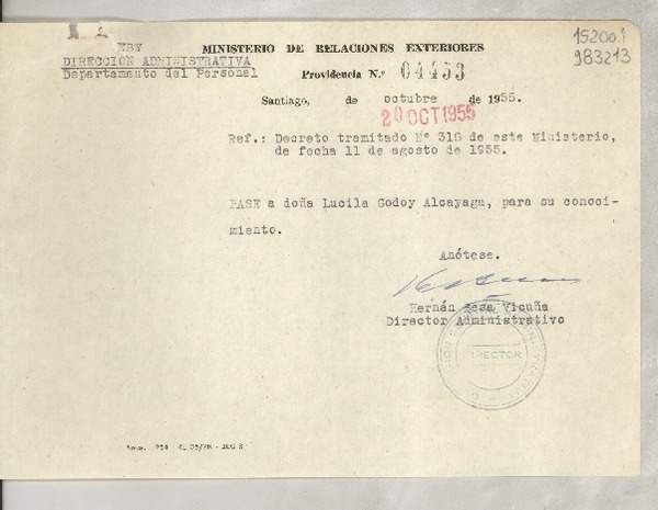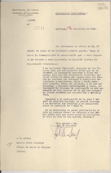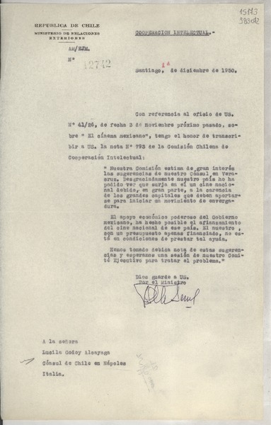 [Oficio] N° 9062, 1948 dic. 22, Fortín, México [al] Señor Ministro de Relaciones Exteriores, Santiago de Chile [manuscrito] / Lucila Godoy.