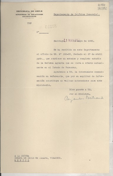 Oficio N° 6740, 1950 feb. 1, México, D.F., México [a la] Señorita, Gabriela Mistral, Cónsul de Chile en Comisión, Veracruz, Ver., [México] [manuscrito] / Enrique Gajardo V. Embajador de Chile.