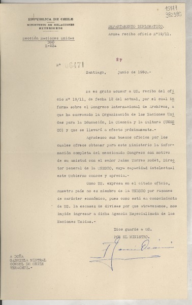 Mistral, Gabriela - Correspondencia - Manuscritos chilenos - Diplomáticos - Huneeus Lavín, Sergio