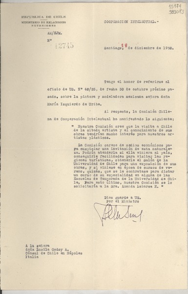 [Oficio] N° 9163, 1948 dic. 22, Fortín, México [al] Señor Ministro de Relaciones Exteriores, Santiago de Chile [manuscrito] / Lucila Godoy.