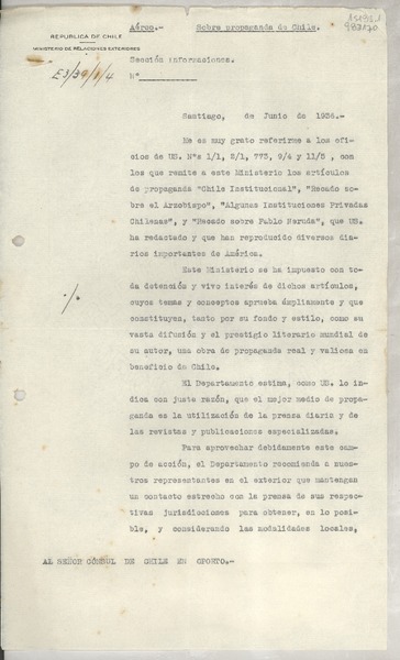 [Circular] N° 1390, 1946 jul. 25, Washington [al] Señor Cónsul General de Chile, Los Angeles, California [manuscrito] Marcial Mora M.
